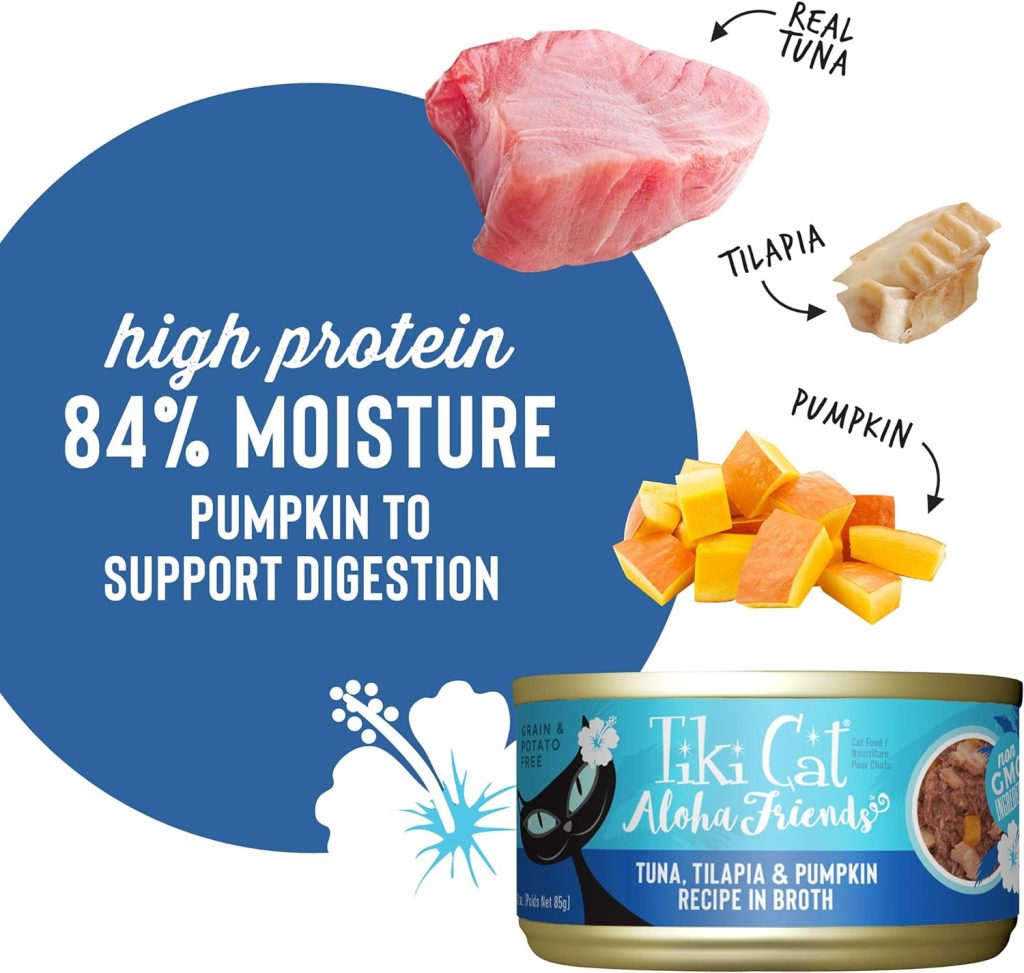 Aloha Friends Wet Cat Food: Tuna, Tilapia & Pumpkin blend.